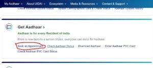 - इस पेज पर आने के बाद आपको Get Aadhaar के सेक्शन में ही आपको Book an Appointment का विकल्प मिलेगा जिस पर आपको क्लिक करना होगा,