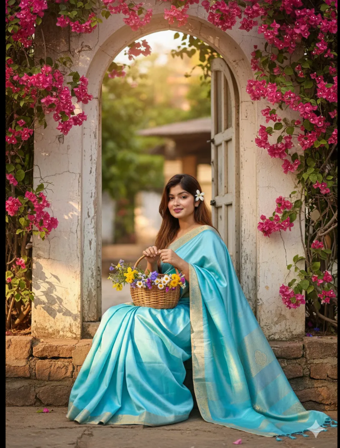 Create a tender, sunlit portrait of the same subject, draped in a sky-blue silk saree with delicate golden embroidery along the border. She is seated gracefully beside an old arched doorway, its faded white paint surrounded by vibrant pink bougainvillea cascading down. A soft triangle of sunlight falls across her lap, creating gentle contrasts of light and shadow. She holds a small wicker basket filled with freshly picked wildflowers, while a single jasmine flower rests behind her ear.