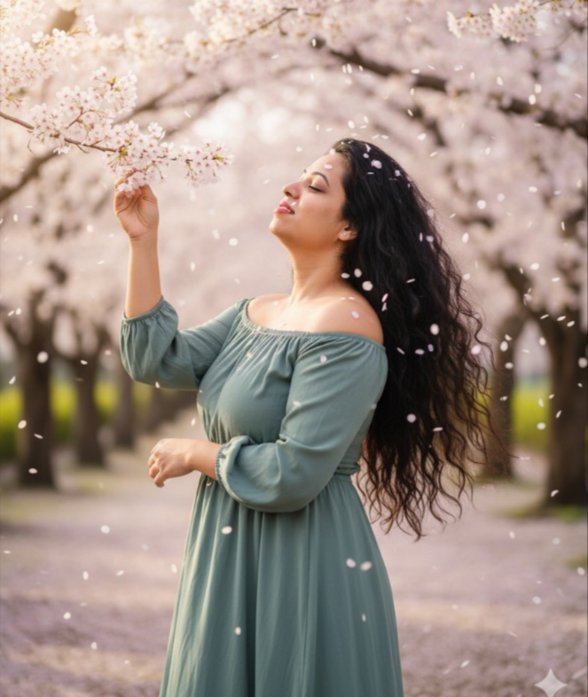 Creat rk HD cinematic 100% orginal accurate face A beautiful woman wearing a pink synthetic saree, standing under a cherry tree during cherryblossom , she is enjoying the cherry blossoms with her eyes closed, she feel and touch blossom cherry flower a sweet smile on her cheeks, her long black curly hair flying.