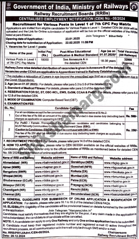 RRB Railway Group D Recruitment 2025:- रेलवे भर्ती बोर्ड (RRB) ने CEN 08/2025 के तहत ग्रुप D (लेवल-1) भर्ती के अलग – अलग पदोें पर सरकारी नौकरी प्राप्त करना चाहते है, तो आपके लिए रेलवे भर्ती बोर्ड द्धारा ग्रुप डी के रिक्त कुल 32,438 पदोें पर RRB Railway Group D Recruitment 2025 को Notification जारी किया गया है | इससे संबंधित जो भी जानकारी आपको चाहिए मैं यहां पर नीचे दी गई है और कैसे आपको आवेदन करना होगा और आप RRB Railway Group D Recruitment 2025 के अंतर्गत कहां जाकर आवेदन कर सकती और इसके लिए किन-किन दस्तावेजों की आवश्यकता होने वाली सारी जानकारी आपको यहां पर मिलने वाली है.