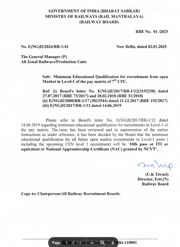 इस आर्टिकल की मदद से हम, आप सभी परीक्षार्थियों का हार्दिक स्वागत करना चाहते है जो कि, आगामी CEN level 1 सहित भविष्य मे सभी Level-l posts पर भर्ती हेतु अप्लाई करेगें उनके लिए ” रेल मंत्रालय “ द्धारा Minimum Educational Qualification Notice को जारी किया गया है जिसके तहत आगामी ग्रुप डी व लेवल 1 पोस्ट्स के लिए अनिवार्य शैक्षणिक योग्यता – 10वीं पास / ITI पास / National Apprenticeship Certificate (NAC) granted by NCVT धारक युवा आवेदन करने हेतु पात्र माने जायेगें।