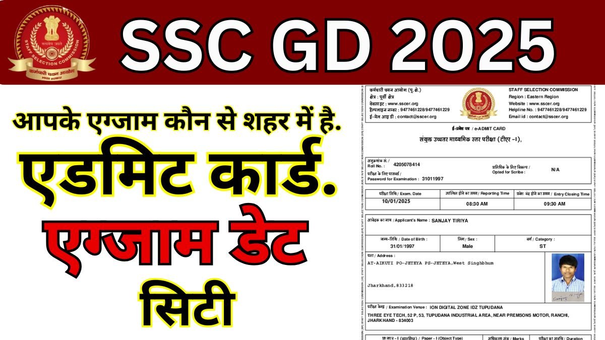 SSC GD City Intimation Slip 2025:- कर्मचारी चयन आयोग (SSC) ने Constable (GD) Recruitment Exam 2025 के लिए Admit Card और Exam City की जानकारी जारी करने की घोषणा कर दी है। यह परीक्षा Central Armed Police Forces (CAPFs), SSF, Assam Rifles में Rifleman (GD) और Narcotics Control Bureau में Sepoy पदों के लिए आयोजित की जाएगी। आप सभी को एग्जाम से पहले अपना एडमिट कार्ड और एग्जाम सिटी को डाउनलोड करना बहुत ही आवश्यक है, क्योंकि यहां पर आपको सारे जानकारी विस्तार से दी गई है।